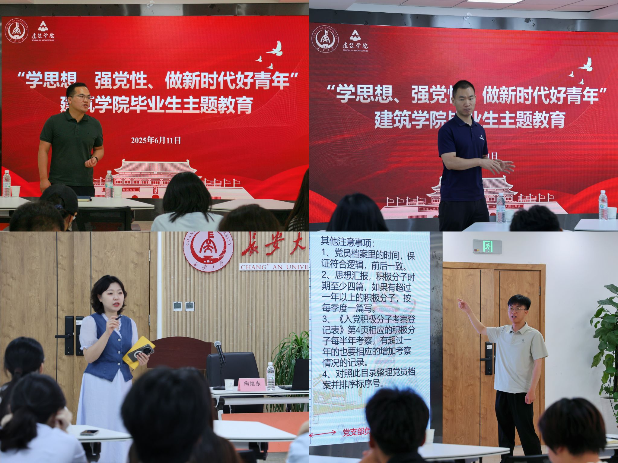 為扎實(shí)有效做好2025年畢業(yè)生離校教育工作,引導(dǎo)畢業(yè)生堅(jiān)定理想信念,厚植家國(guó)情懷,6月11日上午,建筑學(xué)院在北校區(qū)朝暉園社區(qū)二樓團(tuán)體活動(dòng)室開(kāi)展“學(xué)思想、強(qiáng)黨性、做新時(shí)代好青年”畢業(yè)生主題教育活動(dòng)。建筑學(xué)院黨委副書(shū)記王妍婷,學(xué)生工作辦公室副主任、畢業(yè)生輔導(dǎo)員周艷龍,團(tuán)委書(shū)記落昊飛,研究生輔導(dǎo)員王杰,2022級(jí)輔導(dǎo)員李凡及本碩畢業(yè)生代表參加本次活動(dòng)。
