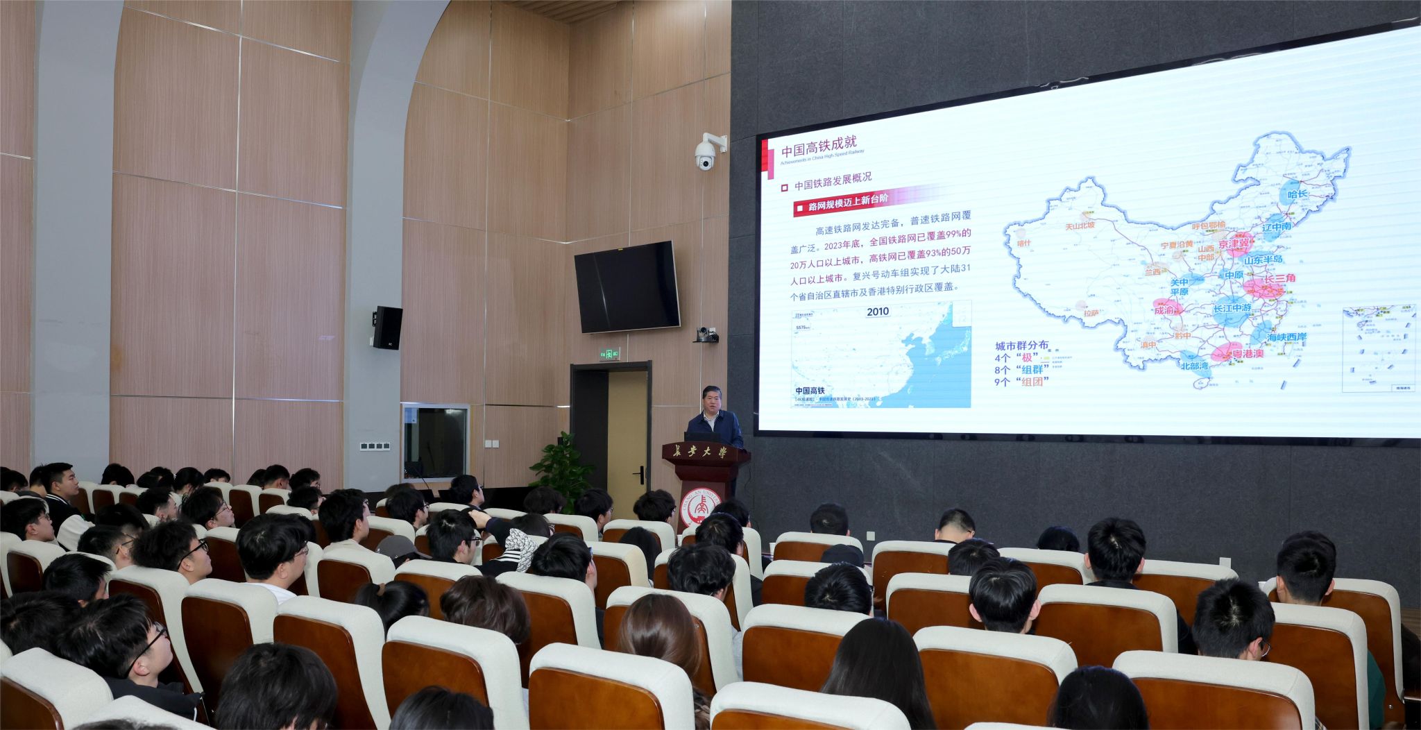 湯友富從中國高鐵發(fā)展歷程回顧、取得成就、成功經(jīng)驗(yàn)、機(jī)遇與挑戰(zhàn)、前景展望五個(gè)方面展開講解。他回顧了我國高鐵發(fā)展簡史、路網(wǎng)建設(shè)的突破與成績,展望了未來高鐵發(fā)展創(chuàng)新痛點(diǎn)。他強(qiáng)調(diào),在“交通強(qiáng)國、鐵路先行”的戰(zhàn)略目標(biāo)引領(lǐng)下,要想實(shí)現(xiàn)鐵路建設(shè)高質(zhì)量發(fā)展,就必須推進(jìn)“鐵路大國”向“鐵路強(qiáng)國”轉(zhuǎn)變,這就需要充分發(fā)揮規(guī)劃設(shè)計(jì)的先導(dǎo)作用。湯友富認(rèn)為勘察設(shè)計(jì)的精髓在于以“人”為核心,服務(wù)于“人”,注入“人的靈性”于工程,他闡釋了科技智慧在工程中解決問題的重要性,鼓勵(lì)同學(xué)們深入學(xué)習(xí)前沿科學(xué)技術(shù)知識(shí),探索突破瓶頸問題的有效方法。