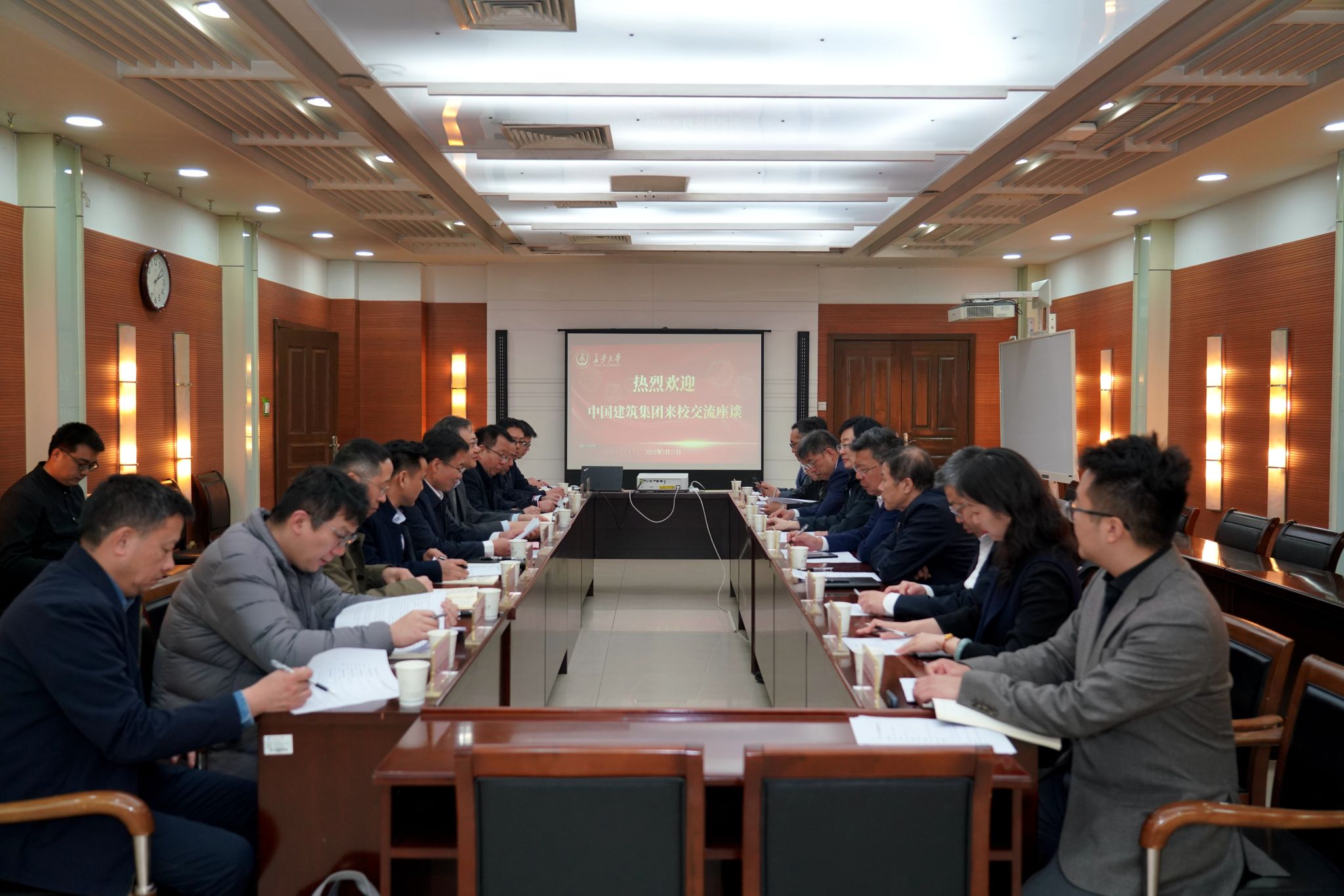中建西北院、中建絲路、中建城市運營(城市改造專班)、中建六局、中海物業等單位負責人及部門負責人,學校黨委辦公室、社會合作處、招生就業處、教育研究與評估中心(教師發展中心)、研究生院/卓越工程師學院、人事處、基建處和建筑學院等單位負責人參加會議。