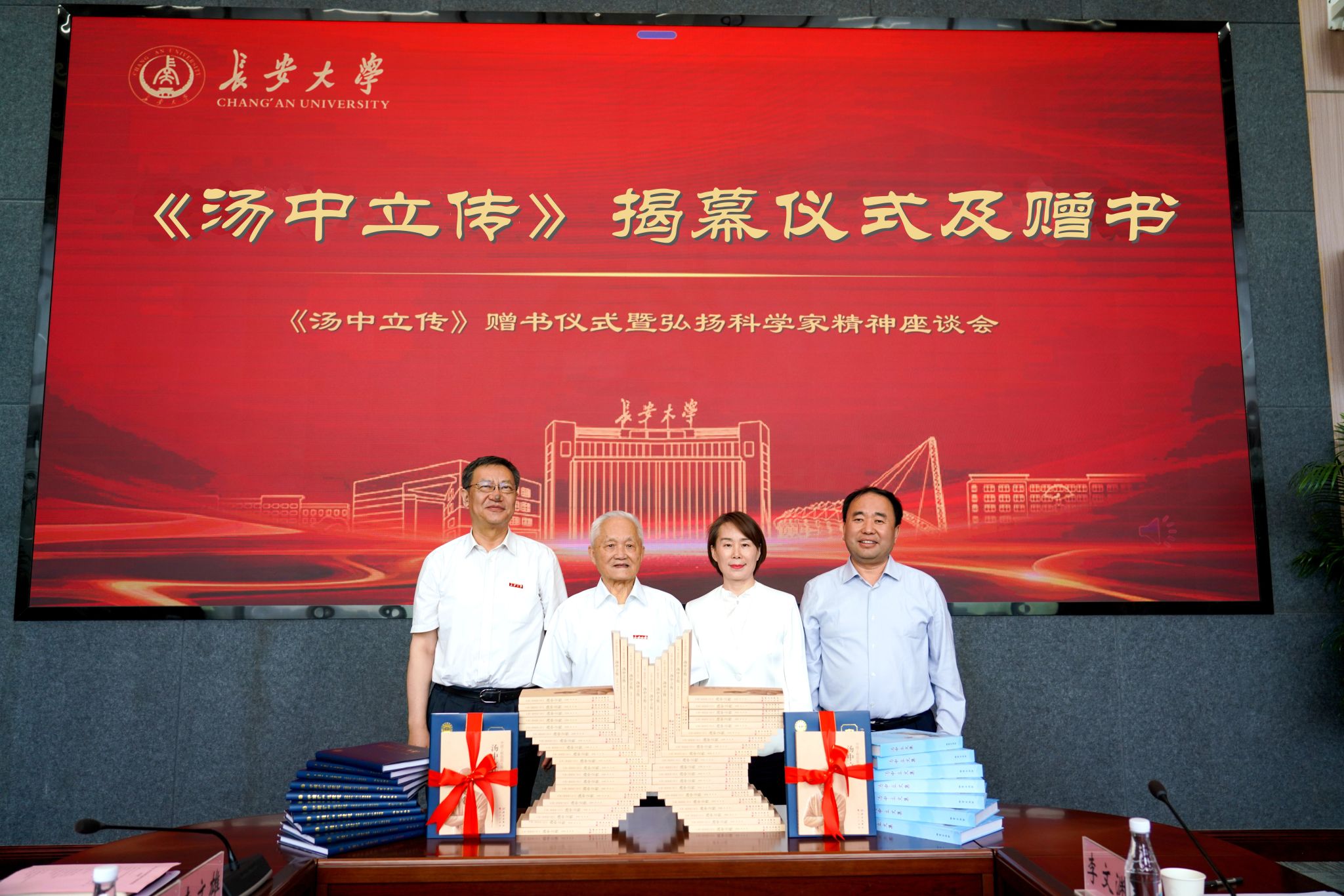 陳志堅、唐淑惠、甘肅省地質(zhì)礦產(chǎn)勘查開發(fā)局黨委副書記成文輝和湯中立教授共同為《湯中立傳》揭幕,湯中立教授向與會各單位、長安大學(xué)圖書館和人才、青年教師代表贈書。
