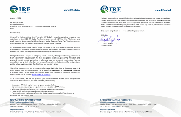 近日,接全球道路聯(lián)合會(IRF Global)通知,由中國公路學(xué)會推薦,我校趙祥模教授團(tuán)隊牽頭,中航電測儀器(西安)股份有限公司、中國汽車技術(shù)研究中心有限公司、西安建筑科技大學(xué)相關(guān)科研人員參與完成的項目成果——基于數(shù)字孿生的自動駕駛整車在環(huán)測試裝備與應(yīng)用,獲得全球道路成就獎(GRAA)。