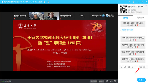 1月18日上午,由研究生院/研究生工作部主辦、水利與環境學院承辦、校研究生科學技術協會協辦的長安大學70周年校慶系列講座(21講)暨“虹”學講堂(251講)通過“騰訊課堂”以線上直播形式順利舉辦。日本京都大學王功輝博士作了題為“地質滑坡災害與減災:現象與新挑戰(Landslide hazards and mitigation: phenomena and newchallenges)”的報告。本次報告由水環學院羅平平教授主持,我校相關學院共計260余名師生參加了此次線上講座。