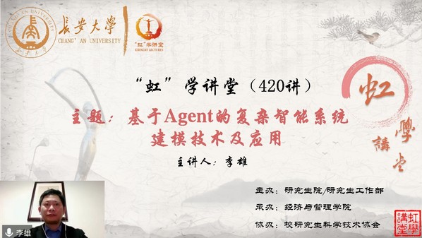 1月13日下午,由研究生院/研究生工作部主辦、經濟與管理學院承辦、校研究生科學技術協會協辦的“虹”學講堂第420講以線上講座形式順利舉辦。中山大學李雄教授作了題為“基于Agent的復雜智能系統建模技術及應用”的報告,經濟與管理學院馬飛教授主持,相關學院共300余名師生參加講座。