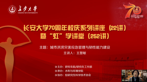 1月22日上午,由研究生院/研究生工作部主辦、水利與環境學院承辦、校研究生科學技術協會協辦的長安大學70周年校慶系列講座(22講)暨“虹”學講堂(252講)通過“騰訊課堂”以線上直播形式順利舉辦。河海大學王慧敏教授作了題為“城市洪澇災害應急管理與韌性能力建設”的報告。本次報告由水環學院羅平平教授主持,我校相關學院共計290余名師生參加了此次線上講座。