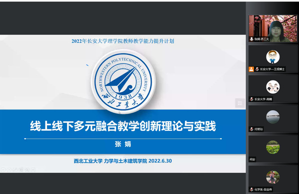 2022年6月30日,西北工業(yè)大學(xué)張娟教授作了題為“線上線下多元融合教學(xué)創(chuàng)新理論與實踐”的講座。講座由理學(xué)院副院長商澤進主持,理學(xué)院和學(xué)校其他學(xué)院教師近120余人參加了講座。
