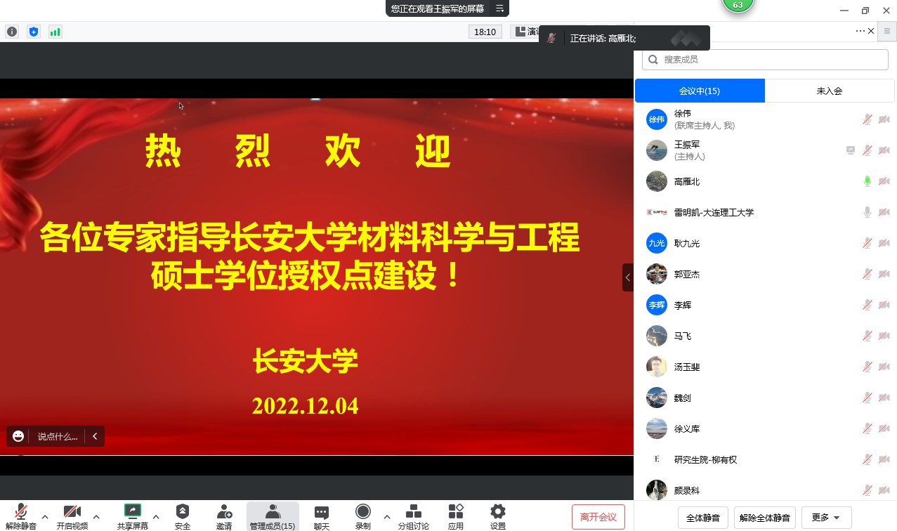 12月4日,材料學院材料科學與工程一級學科碩士學位授權點合格評估自評報告專家評審會在線上召開,會議邀請了國務院學位委員會學科評議組成員、大連理工大學雷明凱教授,燕山大學趙元春教授,西安交通大學馬飛教授,西安建筑科技大學魏劍教授,西安理工大學湯玉斐教授擔任評審專家。我校研究生院副院長柳有權教授,材料學院全體班子成員、學科與專業責任教授、研究生導師代表、研究生教育教學主管、學生辦公室主任、研究生輔導員參加會議。會議由學院黨委書記高雁北主持會議。