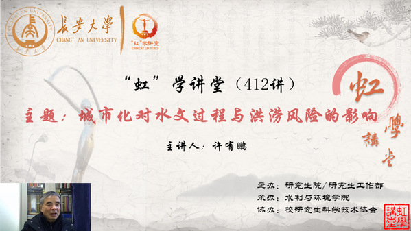 12月3日下午,由研究生院/研究生工作部主辦、水利與環境學院承辦、校研究生科學技術協會協辦的“虹”學講堂第412講以線上講座形式順利舉辦。南京大學許有鵬教授作了題為“城市化對水文過程與洪澇風險的影響”的報告,水環學院羅平平教授主持,相關學院共300余名師生參加講座。