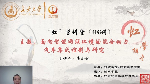 11月29日下午,由研究生院/研究生工作部主辦、汽車學(xué)院承辦、校研究生科學(xué)技術(shù)協(xié)會協(xié)辦的“虹”學(xué)講堂第408講以線上講座形式順利舉辦。重慶大學(xué)唐小林教授作了題為“面向智能網(wǎng)聯(lián)環(huán)境的混合動力汽車集成控制與研究”的報(bào)告,相關(guān)學(xué)院共300余名師生參加講座。
