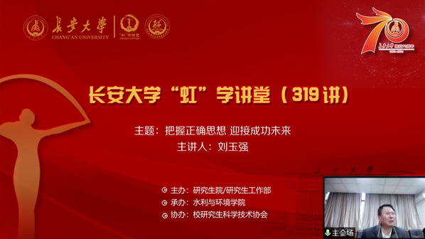 10月20日上午,由研究生院/研究生工作部主辦、水利與環境學院承辦、校研究生科學技術協會協辦的“虹”學講堂第319講通過“騰訊課堂”和“騰訊會議”以線上講座的形式順利舉辦。山東省國土資源廳教授級高級工程師劉玉強作了題為“把握正確思想迎接成功未來”的報告,水環學院黨委書記鄧紅章主持了此次講座,我校相關學院共計300余名師生參加了此次講座。