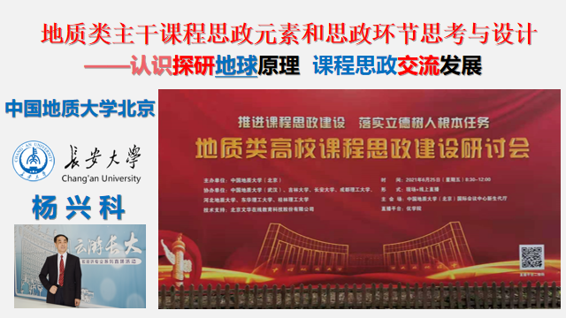 6月25日,全國地質(zhì)類高校課程思政建設(shè)研討會在中國地質(zhì)大學(xué)(北京)召開。研討會由中國地質(zhì)大學(xué)(北京)主辦,中國地質(zhì)大學(xué)(武漢)、吉林大學(xué)、長安大學(xué)、成都理工大學(xué)、河北地質(zhì)大學(xué)、東華理工大學(xué)、桂林理工大學(xué)共同協(xié)辦,文華在線支持,采用線下會議與線上直播方式進(jìn)行,近200名教師、專家參加了現(xiàn)場會議。我校資源學(xué)院楊興科教授應(yīng)邀參加了會議,并進(jìn)行了大會交流。包括資源學(xué)院部分教師在內(nèi)約有300余位教師參加了線上直播會議交流學(xué)習(xí)。