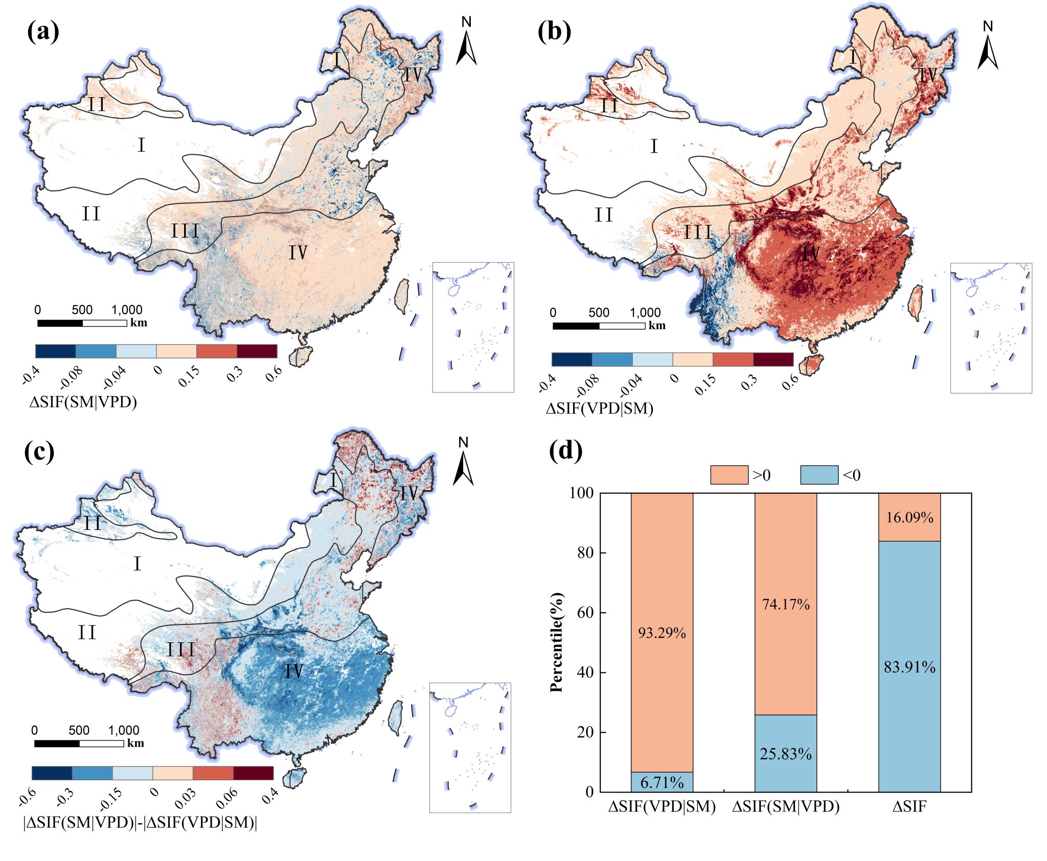 植被生產(chǎn)力作為陸地生態(tài)系統(tǒng)碳封存的關(guān)鍵生態(tài)過程,其受土壤水分(SM)和飽和水氣壓差(VPD)的影響在全球范圍內(nèi)尚存爭議。本研究基于衛(wèi)星遙感與地面觀測的多源數(shù)據(jù),運(yùn)用太陽誘導(dǎo)葉綠素?zé)晒猓⊿IF)作為植被總初級生產(chǎn)力的關(guān)鍵指標(biāo),對中國陸地生態(tài)系統(tǒng)植被生產(chǎn)力的動(dòng)態(tài)變化及其趨勢進(jìn)行了深入評估。通過分箱解耦方法,量化了SM和VPD對生態(tài)系統(tǒng)生產(chǎn)力的相對作用,并分析了其約束效應(yīng)及閾值特性。研究表明,在未來構(gòu)建陸地生態(tài)系統(tǒng)模型以預(yù)測碳吸收變化時(shí),應(yīng)充分考慮SM與VPD的交互作用,這對于區(qū)域尺度上準(zhǔn)確揭示植被生產(chǎn)力長期反饋機(jī)制具有重要意義。
