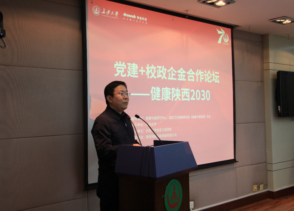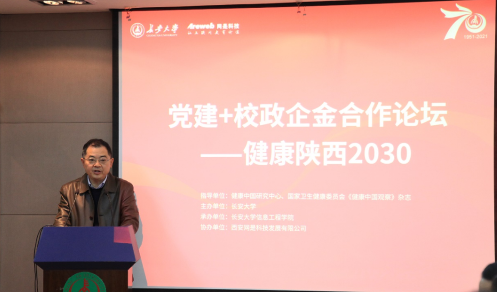 本次論壇由健康中國研究中心、國家衛(wèi)生健康委《健康中國觀察》雜志社指導(dǎo)、長安大學(xué)主辦、長安大學(xué)信息工程學(xué)院承辦、西安網(wǎng)是科技發(fā)展有限公司協(xié)辦。論壇以“健康陜西2030”為主題。長安大學(xué)副校長趙祥模、國家衛(wèi)生健康委《健康中國觀察》雜志副社長王永進(jìn)、陜西省衛(wèi)生健康委員會(huì)黨組成員劉亞軍、中國建設(shè)銀行陜西省分行副行長王文莉、西部證券股份有限公司副總經(jīng)理范江峰、西安網(wǎng)是科技發(fā)展有限公司總經(jīng)理馬航昌、西安交通大學(xué)人文社會(huì)科學(xué)學(xué)院黨委書記許佳輝、長安大學(xué)信息工程學(xué)院黨委書記胡予欣、院長安毅生及學(xué)院全體領(lǐng)導(dǎo)、地市衛(wèi)生健康委員會(huì)代表、區(qū)縣衛(wèi)生健康局代表、相關(guān)企業(yè)、金融機(jī)構(gòu)代表出席了會(huì)議。論壇由長安大學(xué)信息工程學(xué)院黨委書記胡予欣主持。