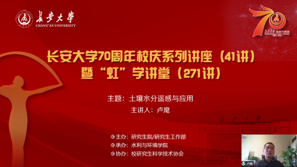 3月22日下午,由研究生院/研究生工作部主辦、水利與環(huán)境學(xué)院承辦、校研究生科學(xué)技術(shù)協(xié)會協(xié)辦的長安大學(xué)70周年校慶系列講座(41講)暨“虹”學(xué)講堂(271講)通過“騰訊課堂”以線上直播形式順利舉辦。清華大學(xué)地球系統(tǒng)科學(xué)系研究員盧麾作了題為“土壤水分遙感與應(yīng)用”的報告。本次報告由水環(huán)學(xué)院羅平平教授主持,我校相關(guān)學(xué)院共計200余名師生參加了此次線上講座。