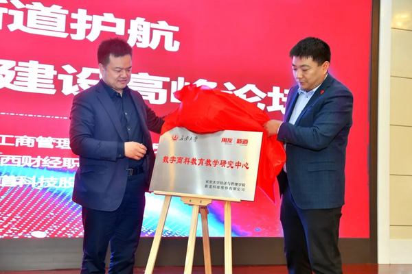杜強與用友新道科技簽署了人才培養戰略合作協議,并為“數字化商科教育教學研究中心”進行揭牌。