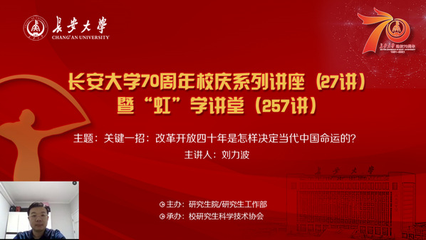 2月4日上午,由研究生院/研究生工作部主辦、校研究生科學技術協會承辦的長安大學70周年校慶系列講座(27講)暨“虹”學講堂(257講)通過“騰訊課堂”線上直播形式順利舉辦。陜西師范大學劉力波教授作了題為“關鍵一招:改革開放四十年是怎樣決定當代中國命運的?”的報告,我校共計220余名師生參加了此次線上講座。