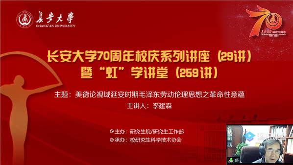 2月20日晚,由研究生院/研究生工作部主辦、校研究生科學技術協會承辦的長安大學70周年校慶系列講座(29講)暨“虹”學講堂(259講)通過“騰訊課堂”以線上直播形式順利舉辦。西北大學馬克思主義學院李建森教授作了題為“美德論視域延安時期毛澤東勞動倫理思想之革命性意蘊”的報告,我校相關學院共計210余名師生參加了此次線上講座。
