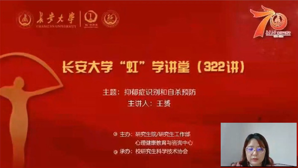 11月5日下午,由研究生院/研究生工作部、心理健康教育與咨詢中心主辦、校研究生科學技術協會承辦的“虹”學講堂第322講通過“騰訊課堂”以線上講座的形式順利舉辦。此次特邀長安大學心理健康教育與咨詢中心專任教師王赟作了題為“抑郁癥識別和自殺預防”的報告。我校相關學院共計400名師生參加了此次講座。
