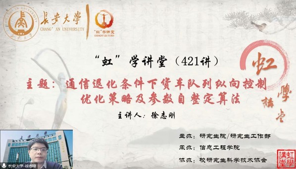 1月15日晚,由研究生院/研究生工作部主辦、信息工程學院承辦、校研究生科學技術協會協辦的“虹”學講堂第421講以線上講座形式順利舉辦。長安大學徐志剛教授作了題為“通信退化條件下貨車隊列縱向控制優化策略及參數自整定算法”的報告,相關學院共200余名師生參加講座。