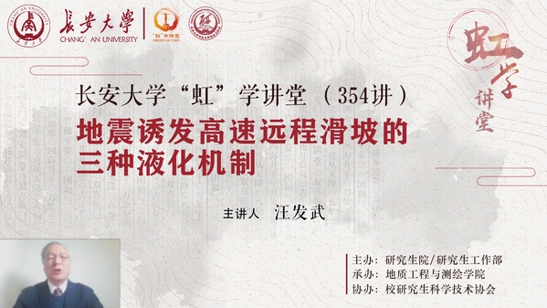 3月29日晚,由研究生院/研究生工作部主辦、地質工程與測繪學院承辦、校研究生科學技術協會協辦的“虹”學講堂第354講以線上講座形式舉辦。日本工程院外籍院士汪發武作了題為“地震誘發高速遠程滑坡的三種液化機制”的報告,地質工程與測繪學院李萍教授主持了此次講座,相關學院共300余名師生參加。