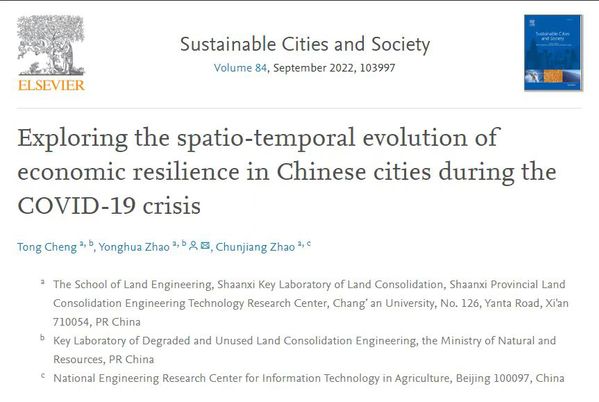 近日,我校土地工程學院博士生程通在導師趙春江院士和趙永華教授的共同指導下于工程技術國際頂級雜志《Sustainable Cities and Society》上發表研究論文”Exploring the spatio-temporal evolution of economic resilience in Chinese cities during the COVID-19crise”(探索中國城市在COVID-19危機期間經濟韌性的時空演化)。