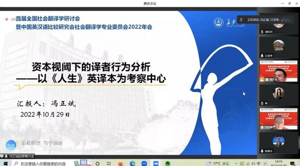 為進一步推動我國社會翻譯學研究,促進翻譯學科建設和人才培養,助力我國對外翻譯能力與國際傳播能力的協調發展,為國內專家學者搭建學術交流和對話的平臺,“首屆全國社會翻譯學研討會暨中國英漢語比較研究會社會翻譯學專業委員會2022年年會”于10月28日至30日召開。外國語學院馮正斌教授和秦思博士受邀出席,二人分別以“資本視閾下的譯者行為分析—以《人生》英譯本為考察中心”和“美國的中國古典禪詩譯者研究—以薩姆·漢米爾與赤松為例”為題做了大會交流。