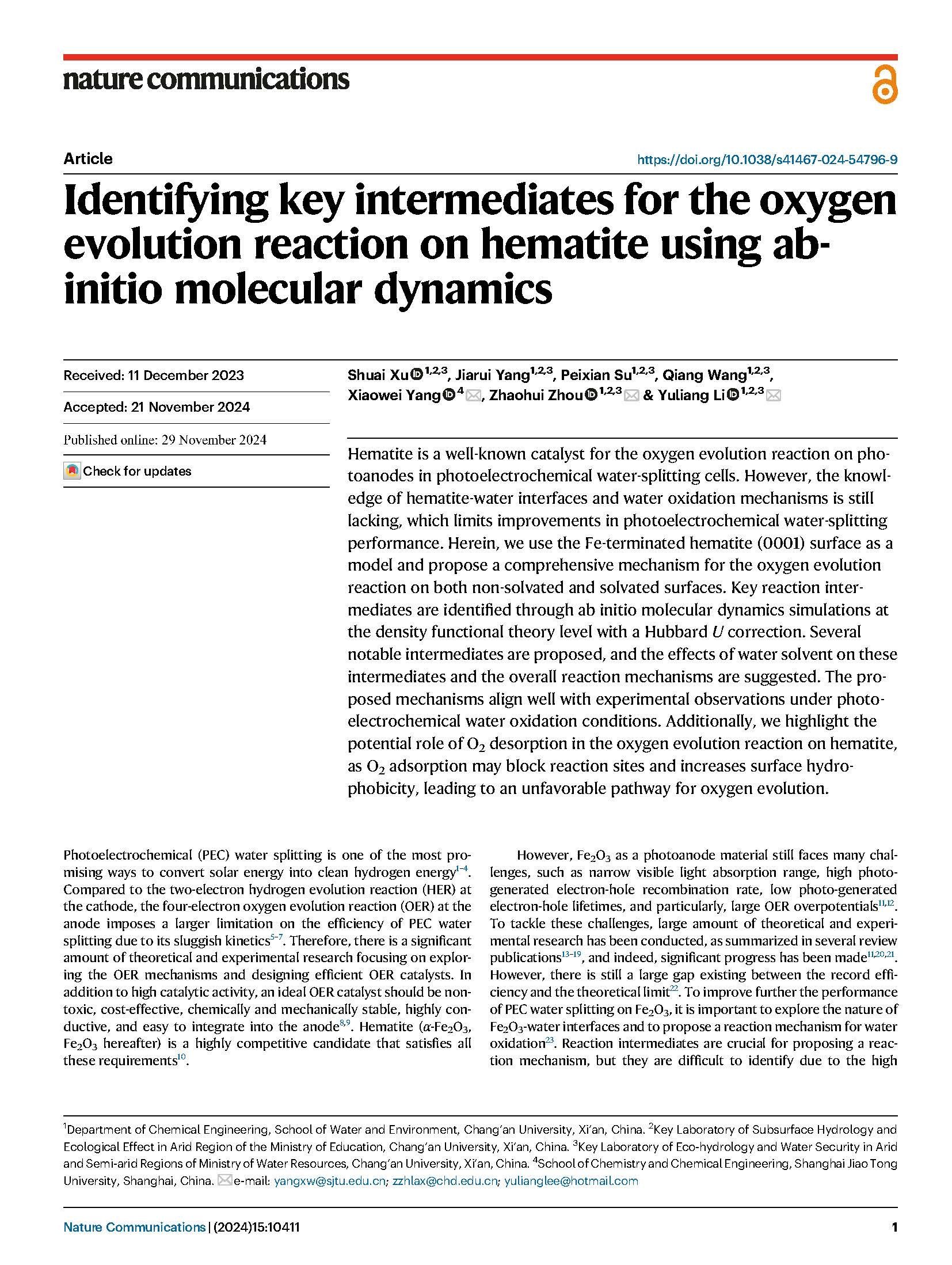 11 月 29 日,我校水利與環境學院李宇亮教授/周朝暉副教授在《自然》(《Nature》)雜志子刊《自然·通訊》(Nature Communications)在線發表了題為“Identifying key intermediates for the oxygen evolution reaction on hematite using ab-initio molecular dynamics”的研究論文(Article)。長安大學為第一署名單位和第一通訊單位。第一作者為我校博士研究生徐帥,李宇亮/周朝暉和上海交通大學楊曉偉教授作為共同通訊作者。