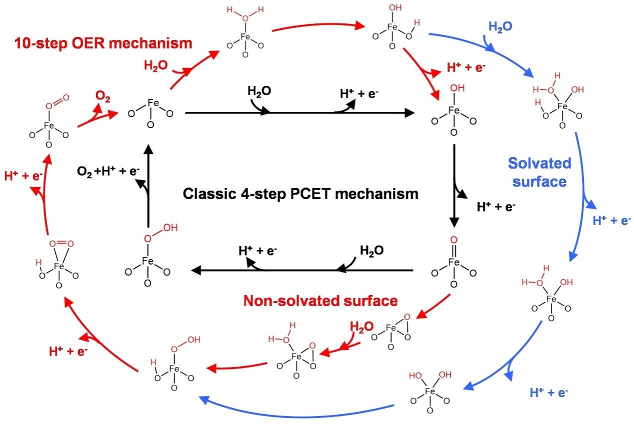 Fe終結的Fe2O3 (0001)表面氧析出反應(OER)機制示意圖(展示了非溶劑化和溶劑化表面上的關鍵反應中間體及反應路徑)