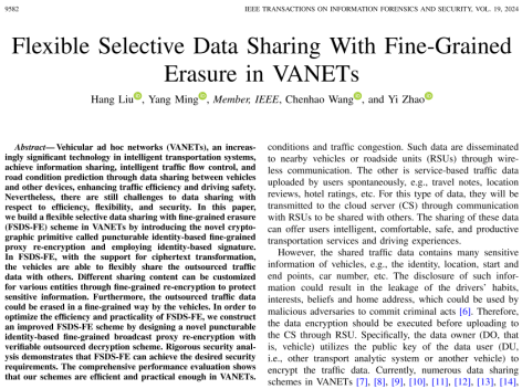 論文信息:Hang Liu, Yang Ming, Chenhao Wang, and Yi Zhao. Flexible selective data sharing with fine-grained erasure in VANETs. IEEE Transactions on Information Forensics and Security, 2024, 19: 9582-9597.