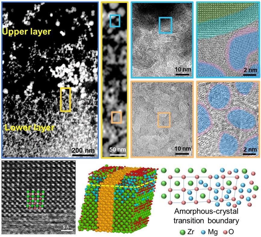 陶瓷材料應(yīng)用中的一個(gè)主要挑戰(zhàn)是強(qiáng)度和韌性之間的權(quán)衡。此研究通過構(gòu)建多尺度異構(gòu)結(jié)構(gòu)陶瓷涂層(HSCC)來應(yīng)對這一挑戰(zhàn)。受天然貝殼啟發(fā),研究團(tuán)隊(duì)基于“磚-砂”納米級結(jié)構(gòu),通過調(diào)控強(qiáng)化相(磚)和塑性相(砂)的成分和比例,在膜層中建立了微米級外強(qiáng)內(nèi)韌的雙層結(jié)構(gòu)。研究發(fā)現(xiàn),HSCC具有高達(dá)700°C的高相組成和結(jié)構(gòu)熱穩(wěn)定性,與傳統(tǒng)晶體涂層相比,其抗剪切應(yīng)變能力提高了65%。鋯原子穩(wěn)定了增強(qiáng)相的邊界,促進(jìn)了順應(yīng)相的變形,使得分層結(jié)構(gòu)能夠通過同質(zhì)相界面有效利用塑性相的變形能力和強(qiáng)化相的強(qiáng)度。這項(xiàng)研究為提高陶瓷功能復(fù)合材料的韌性和降低其脆斷傾向提出了一種可行的設(shè)計(jì)和實(shí)現(xiàn)方法。