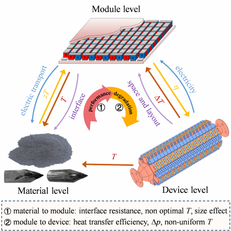 熱電系統能夠實現熱能和電能之間的直接轉換,已成為余熱回收和熱管理等領域備受關注的技術路線之一。目前研究主要聚焦于熱電材料、模塊或器件的單一層面,例如開發(fā)先進的熱電材料、新的熱電模塊構型或高效的換熱器結構,以提升熱電系統的性能。然而,為了全面提升熱電系統的效率,需要綜合考慮材料層、模塊層和器件層之間的內在聯系,促進熱電系統更廣泛的應用。本論文總結了隨著熱電從材料層拓展至器件層的性能退化內在因素,并探討了材料、模塊和器件設計中的優(yōu)化策略。最終,研究團隊提出了跨層次的內聯優(yōu)化策略,強調了不同層面之間的相互依存性,以實現高效的熱電轉化。